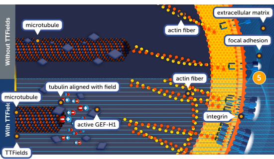 TTFields exert directional forces on polar tubulins, leading to their alignment in the direction of the field. This in turn, leads to the reorganization of the microtubule network, resulting in changes in the number of microtubules, interference with the directionality of cellular migration, and initiation of the GEF-H1/RhoA/ROCK signaling pathway…1